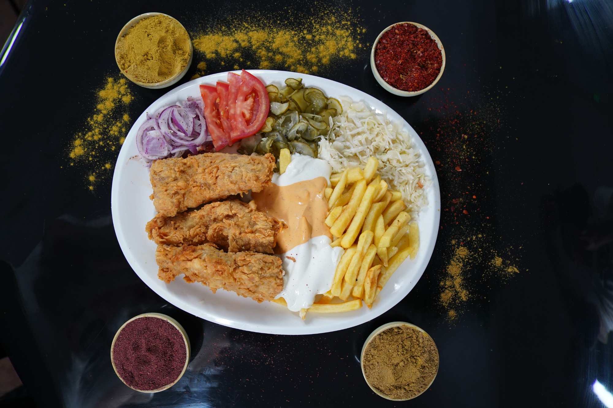 Carne de Pui / Vita , cartofi prajiti , salată de varză,castraveți murați/ proaspeti, roșii, ceapa rosie , tzatziki, sos usturoi , sos semi picant , ketchup , (sos curry optional )