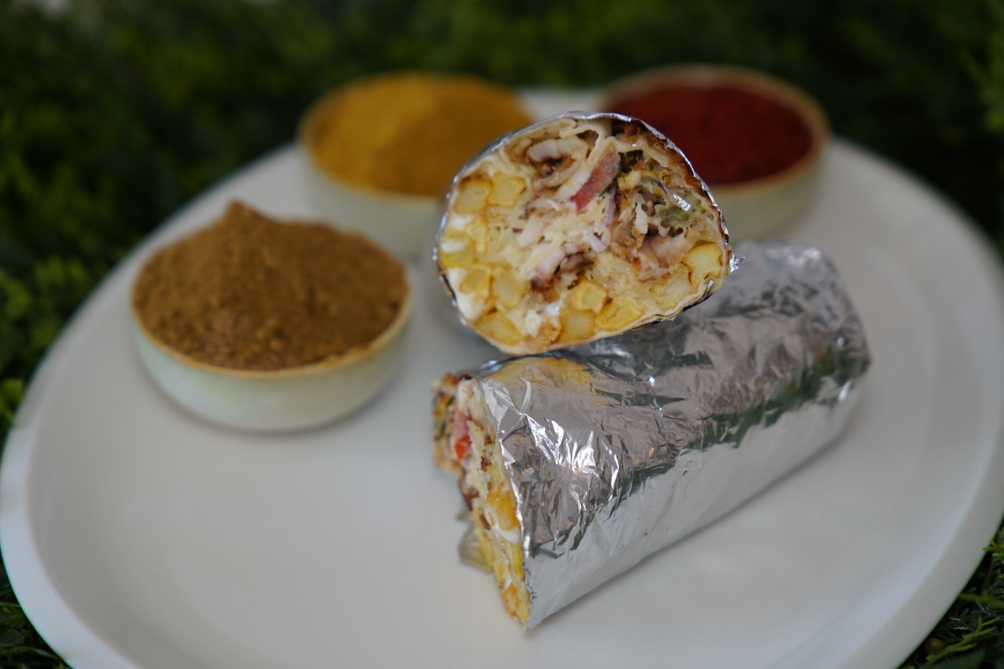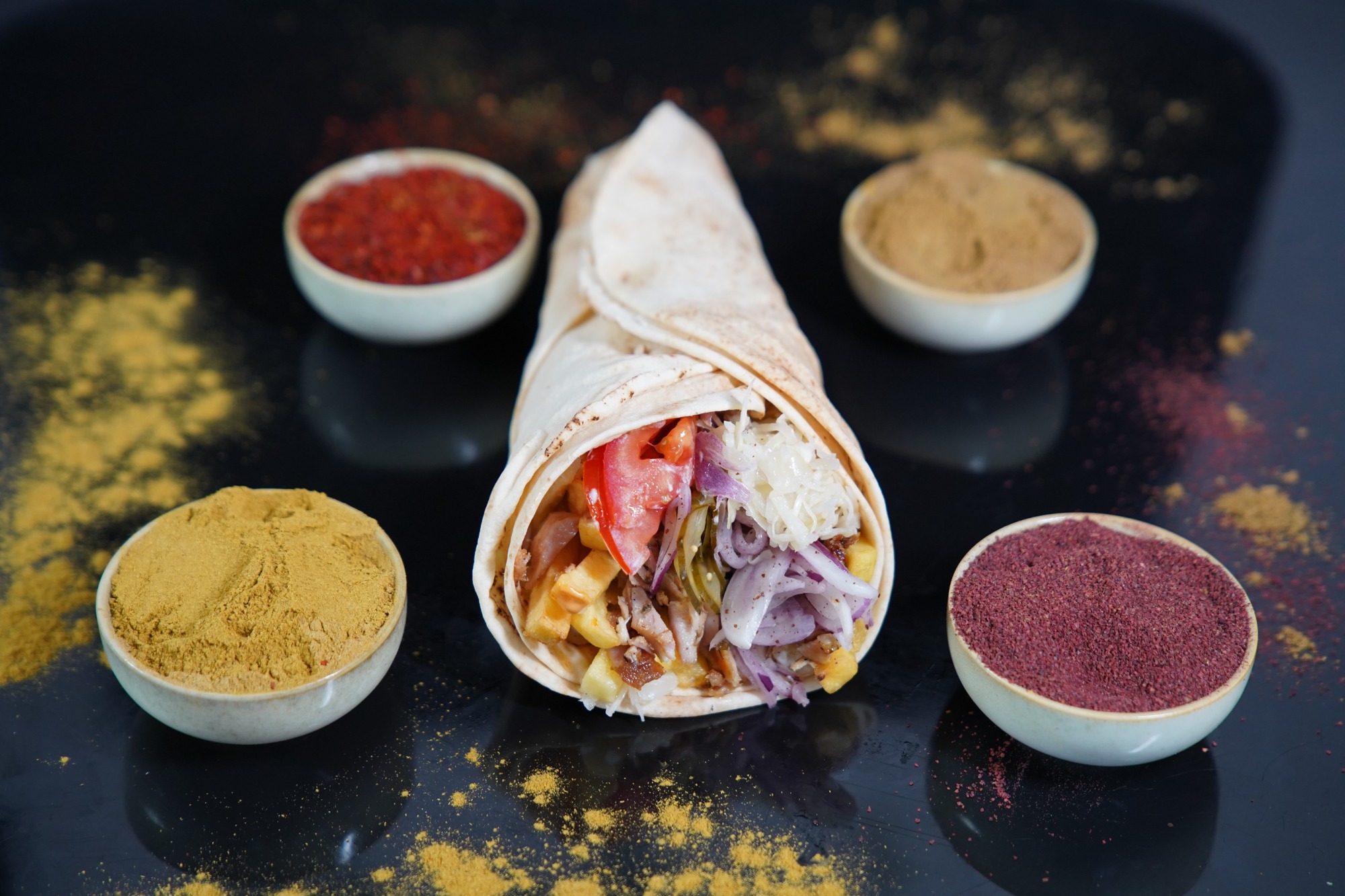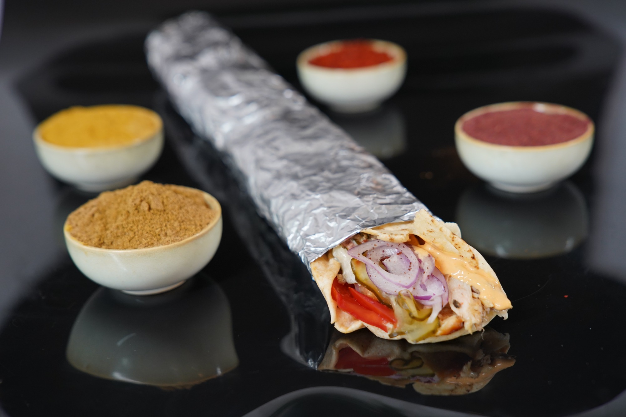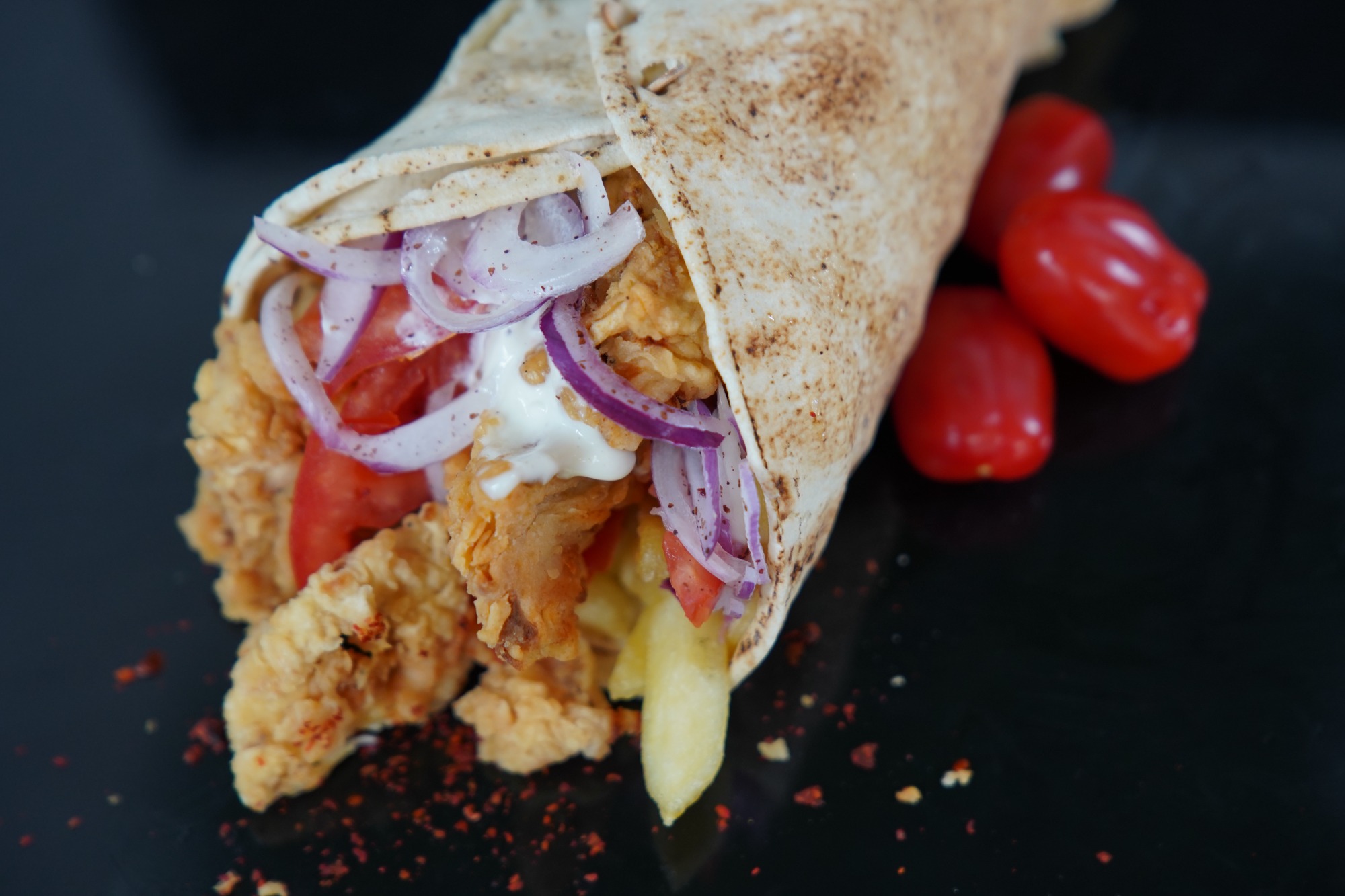 Carne de Pui , Tortilia ,castraveți murați, roșii, ceapa rosie , sos usturoi , sos semi picant , ketchup , (sos curry optional )