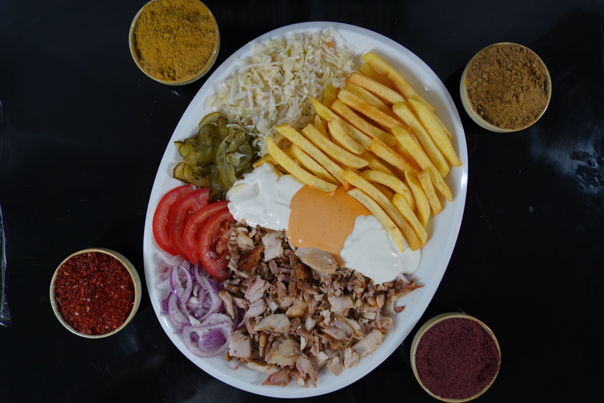 Carne de Pui / Vita , cartofi prajiti , salată de varză,castraveți murați/ proaspeti, roșii, ceapa, tzatziki, sos usturoi , sos semi picant , ketchup , (sos curry optional )