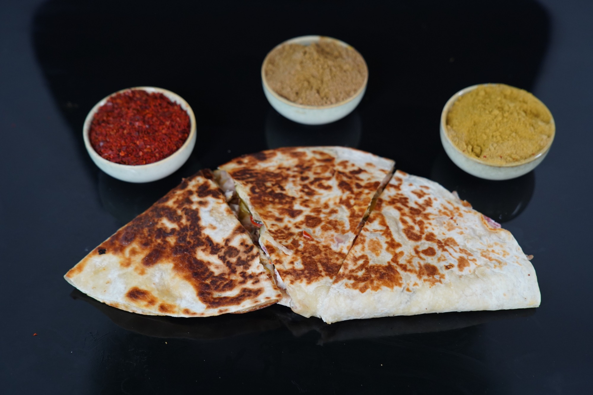 Carne de Pui , Tortilia,chedar,mozarella, roșii,castraveți murați ,ceapă ,sos usturoi , sos semi picant